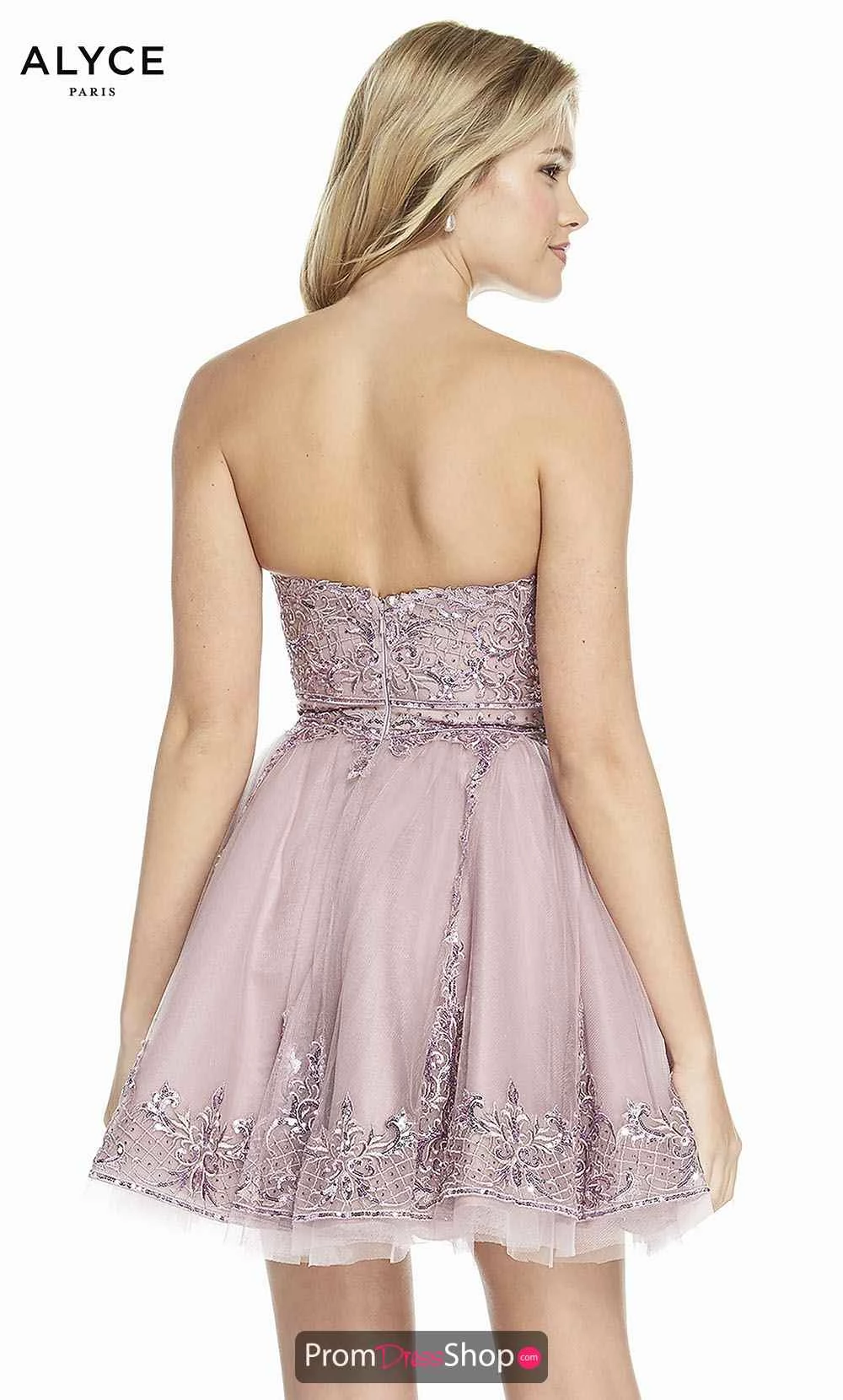 Enchanting Alyce Paris gown will wow the crowd the minute you step afoot at your homecoming dance. Short dress 3841, showcases a classy strapless neckline thus flaunting a fitted lace bodice with shimmering beading. Featuring a full skirt with a dazzling tulle on tulle material adorned with an applique trimming.