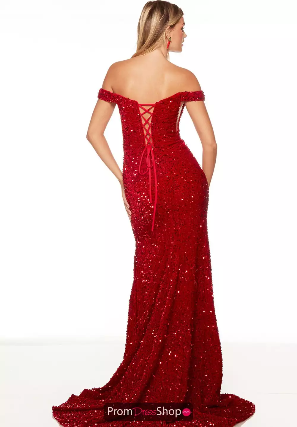 Look ready to pose at the red carpet in this stunning long fitted gown by Alyce Paris 61343. This gown showcases an off the shoulder v cut neckline and flattering thigh high slit. The fitted silhouette is made from a beaded sequin material, perfect to show off your curves. Completing the look with a corset lace up back for the most flattering fit.