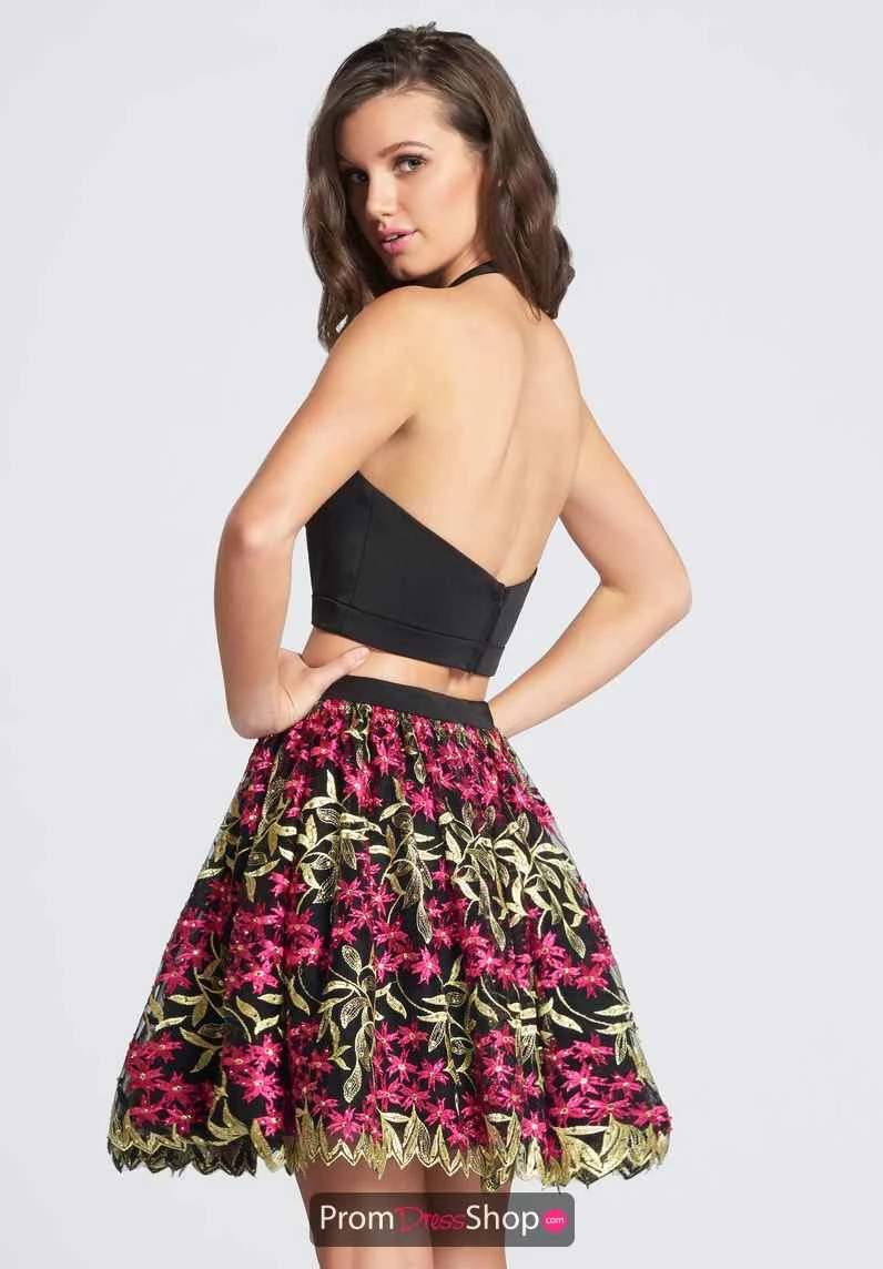 We are loving this unique two piece homecoming dress EW21760S from Ellie Wilde. Solid jersey crop top hugs your body just right. Halter neckline compliments a sexy open back. A-line skirt is decorated with bold embroidery in vibrant colors perfect for standing out from the crowd. Shop more of the 2017 Ellie Wilde collection at PromDressShop.com
