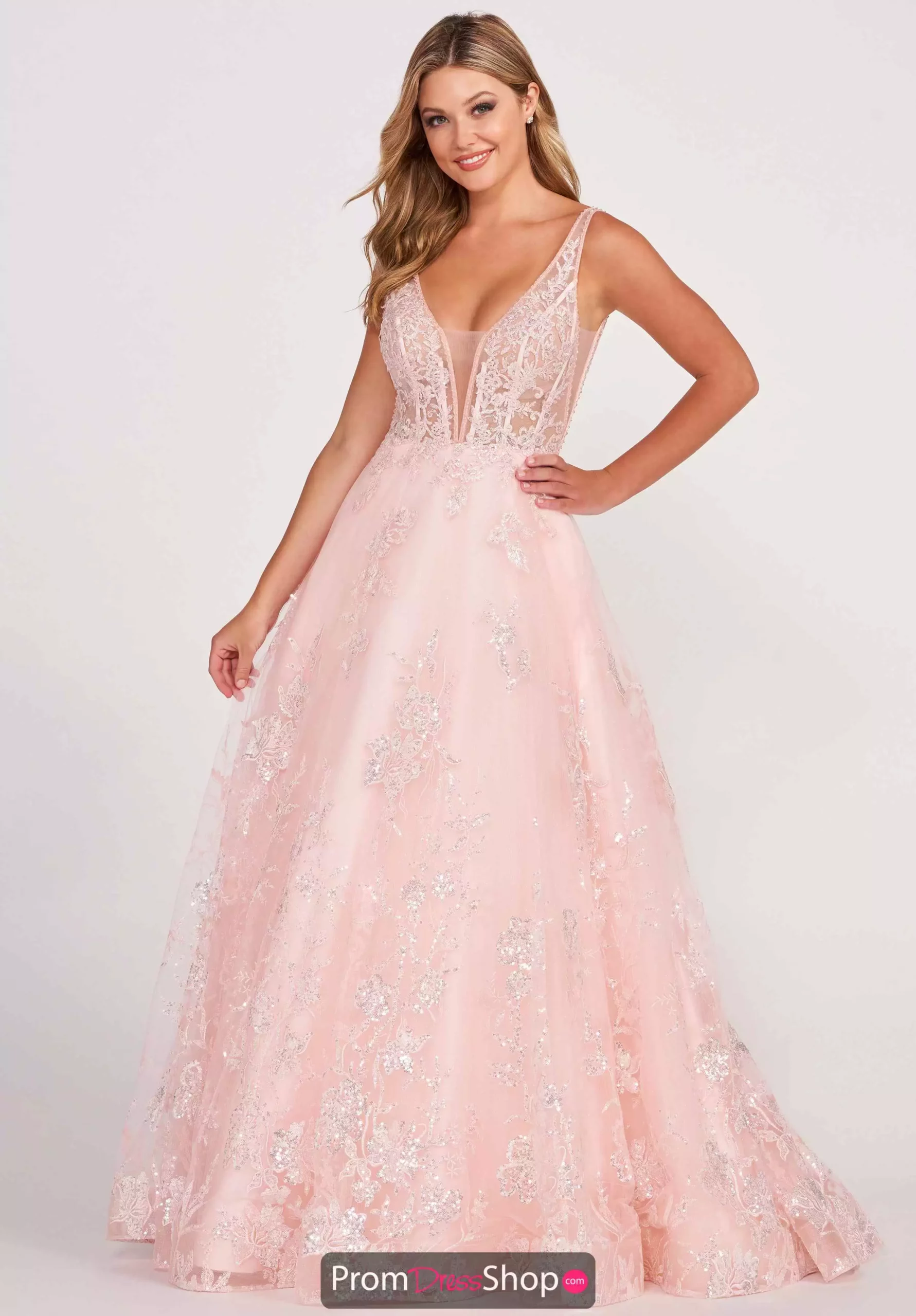 Wear this charming Ellie Wilde long dress EW34105 for your special event. This a line silhouette showcases a graceful v neckline with straps for support. The fitted bodice is garnished with gorgeous embroidery that flows beautifully down to the full glitter tulle skirt that features must have pockets.