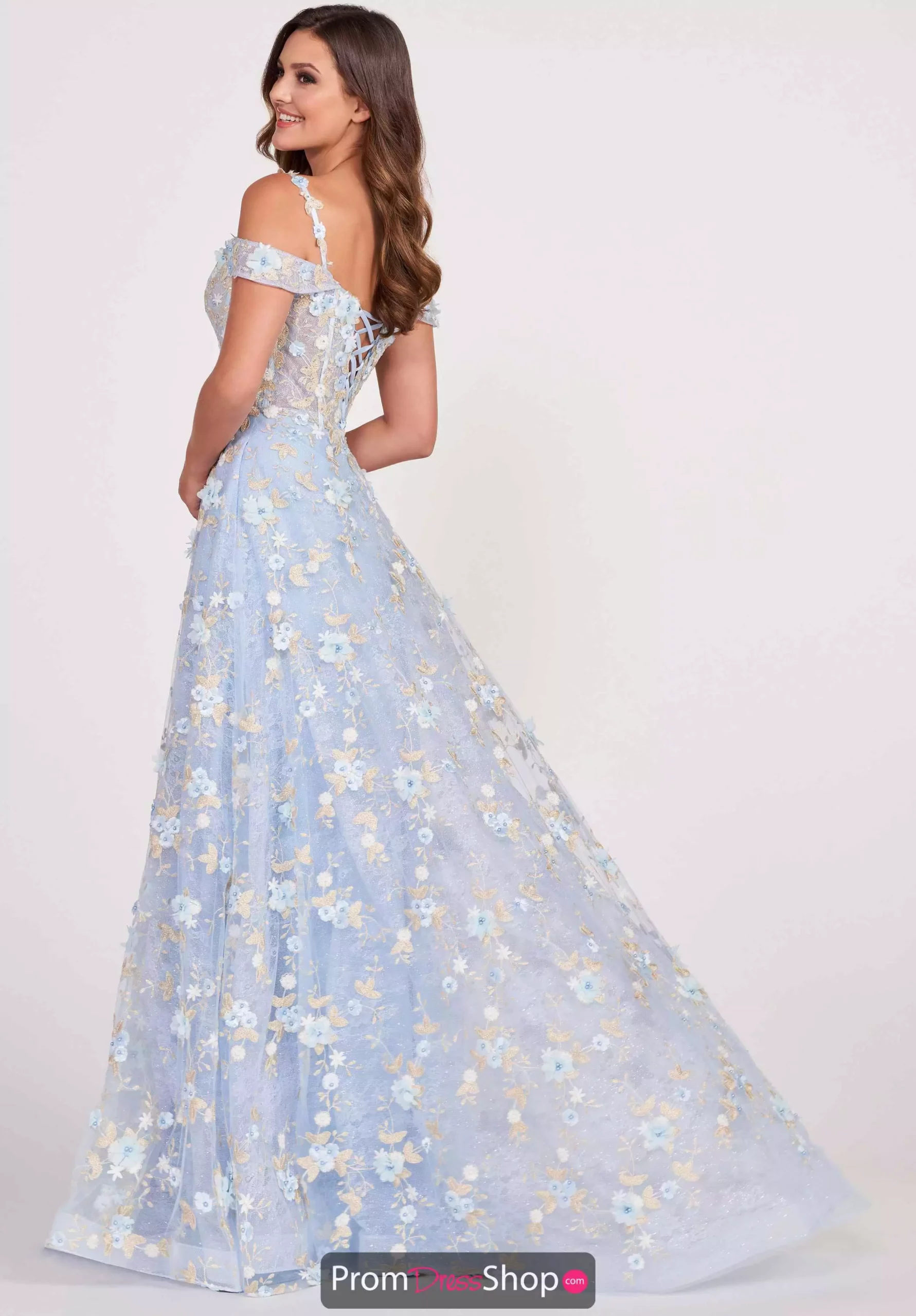 Have a elegant night in this absolutely charming Ellie Wilde long dress EW34122. This lovely a line silhouette showcases a v cut neckline wit off the shoulder cap sleeves. The sheer fitted corset top is decorated with unique embroidery flowing down the glitter tulle skirt, cracked ice detailing adds the perfect amount of glitter and sparkle.