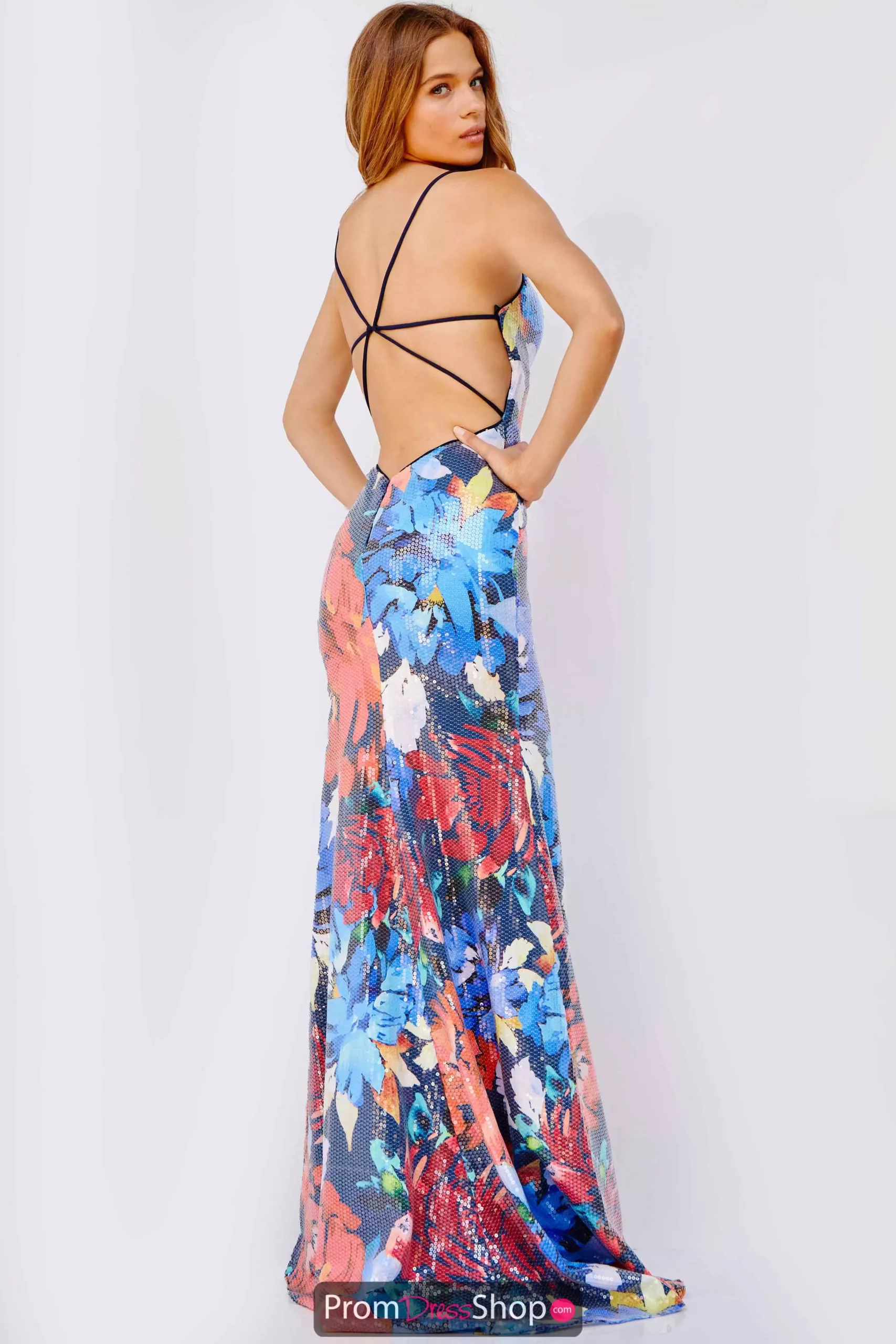 There is no way you will not get noticed at your next event in this multicolored Jovani 12823906 evening gown. The classic v neckline and spaghetti straps that seep into a strap pattern on the back easily snatch the bodice perfectly. The structured silhouette has been crafted to sculpt and hug your every curve while revealing a lovely slit.