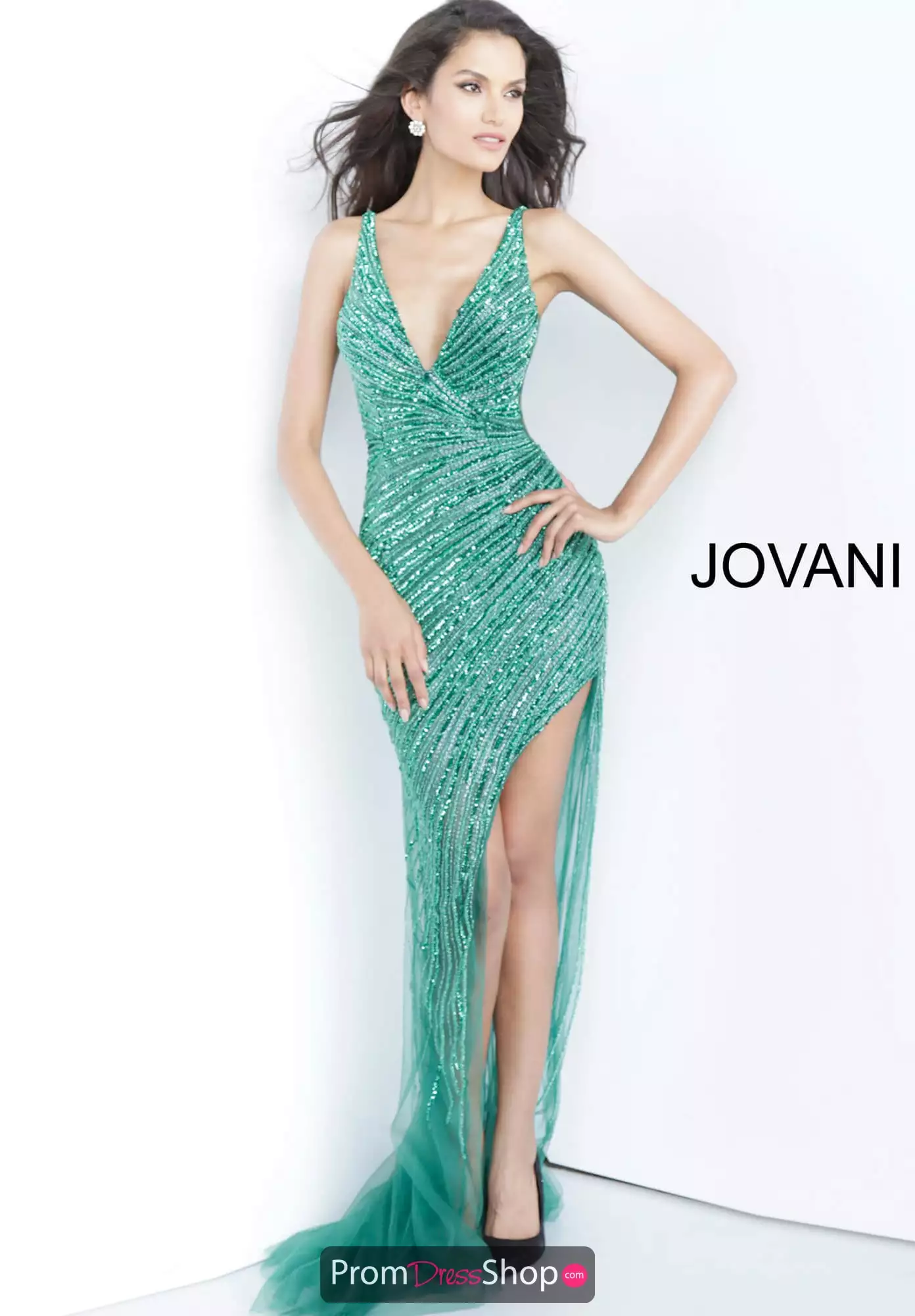 Jaws will drop when you enter your special event in this sexy Jovani dress 63405. This stunning style features a plunging neckline, an open back, and deep side cuts. The fitted style clings to your curves, with shimmering beads cascading down your form and tapering off towards the bottom. The dress features a sexy thigh high slit and ends with a sheer train.
