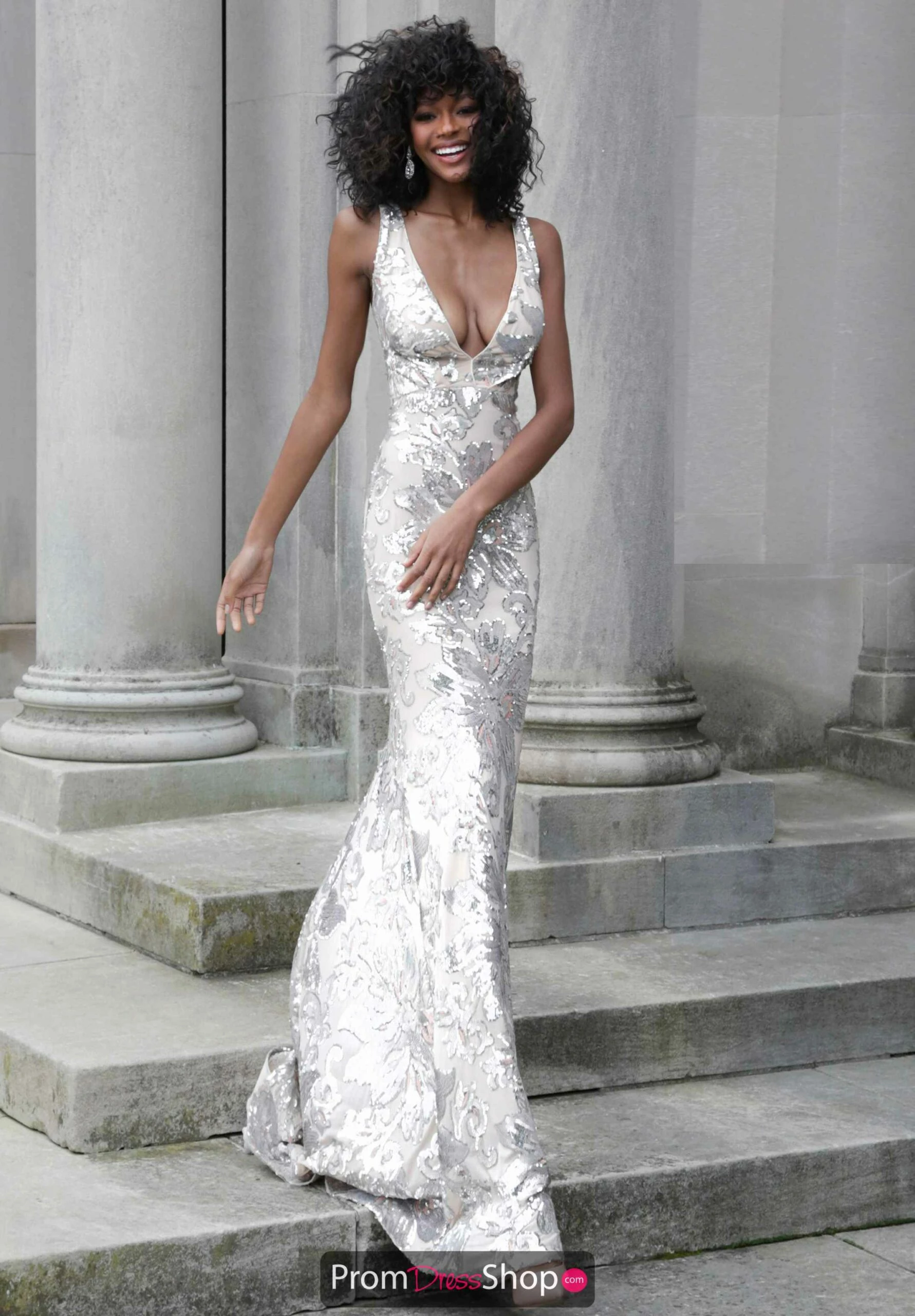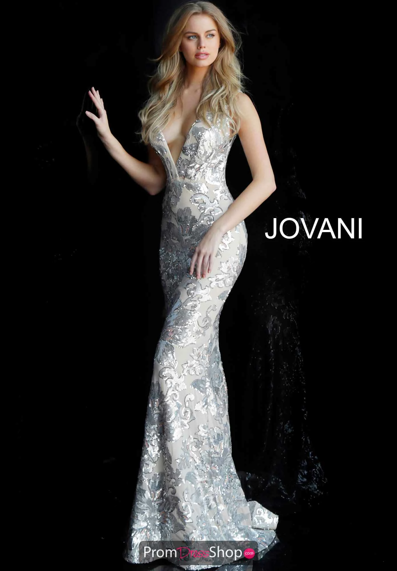Captivating Jovani prom dress 65578 showcases a v neckline and slim silhouette. You will fall in love with this dramatic style that features a plunging v cut neckline with thick straps which then leads into a sexy open back. The slim fitting silhouette will shape your figure since it is made with a shimmering floral fabric. To complete the look, the sweep train flows out, making it the perfect finishing touch.