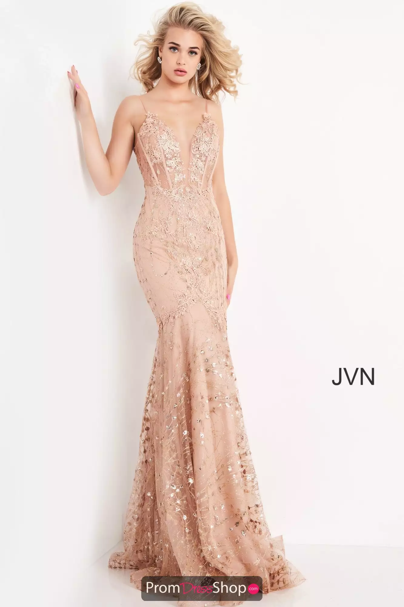 Get that red carpet look with this astonishing gown JVN05788 by JVN. Displaying a plunging neckline that is paired with a sheer panel, this stunning fitted dress will definitely be a show stopper. Corset, sheer bodice is beautifully adorned with lace applique and stunning beadwork all along the fitted skirt onto the dazzling sweep train.