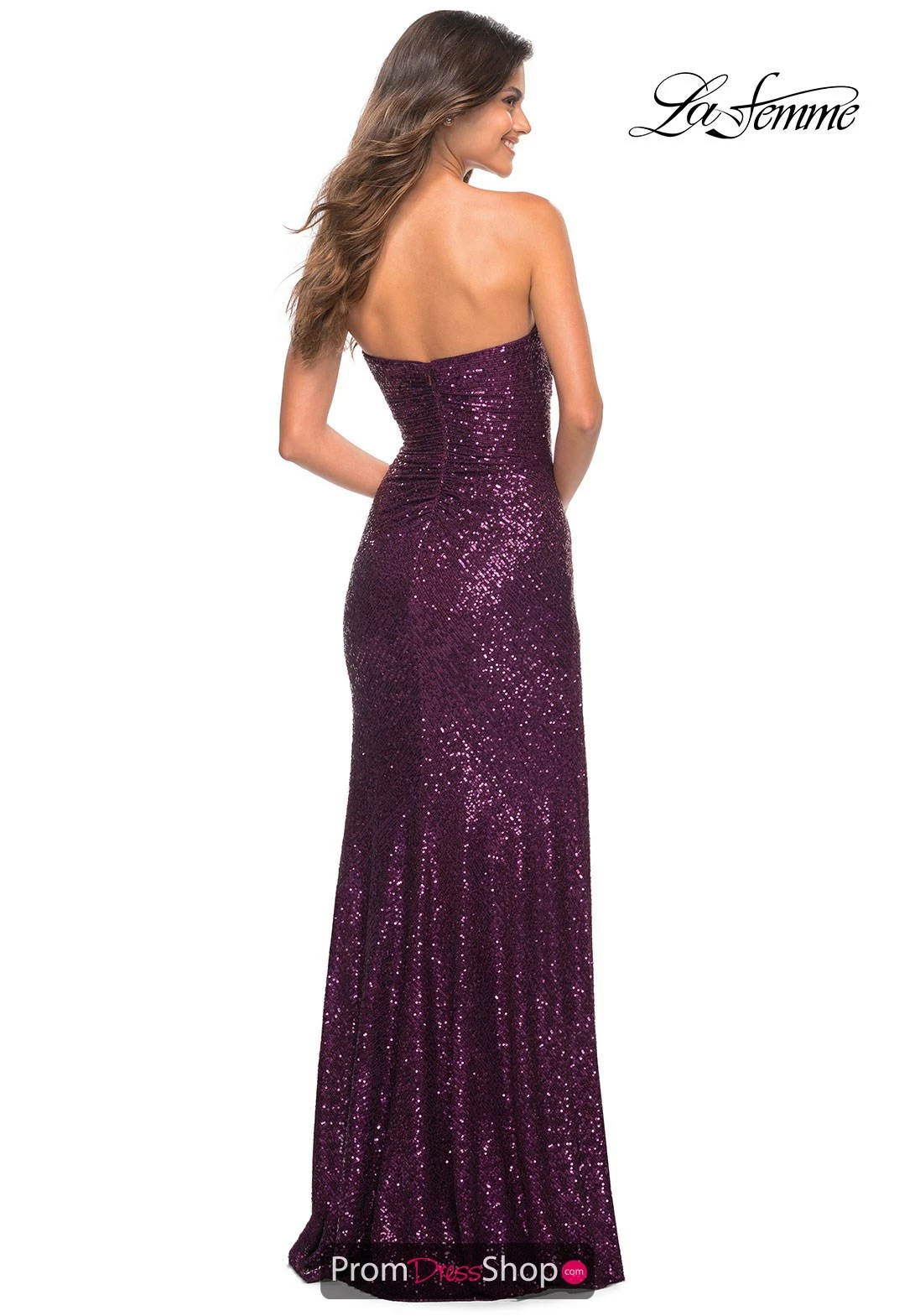 Flatter your body perfectly wearing the La Femme long style 29675. Having an absolutely gorgeous strapless neckline paired with a fully enclosed back with a zipper. Showcasing the ruching that sits right above the thigh high slit and make their way up the bodice. Fully embellished with sparkling sequin to have you tastefully sparkling.
