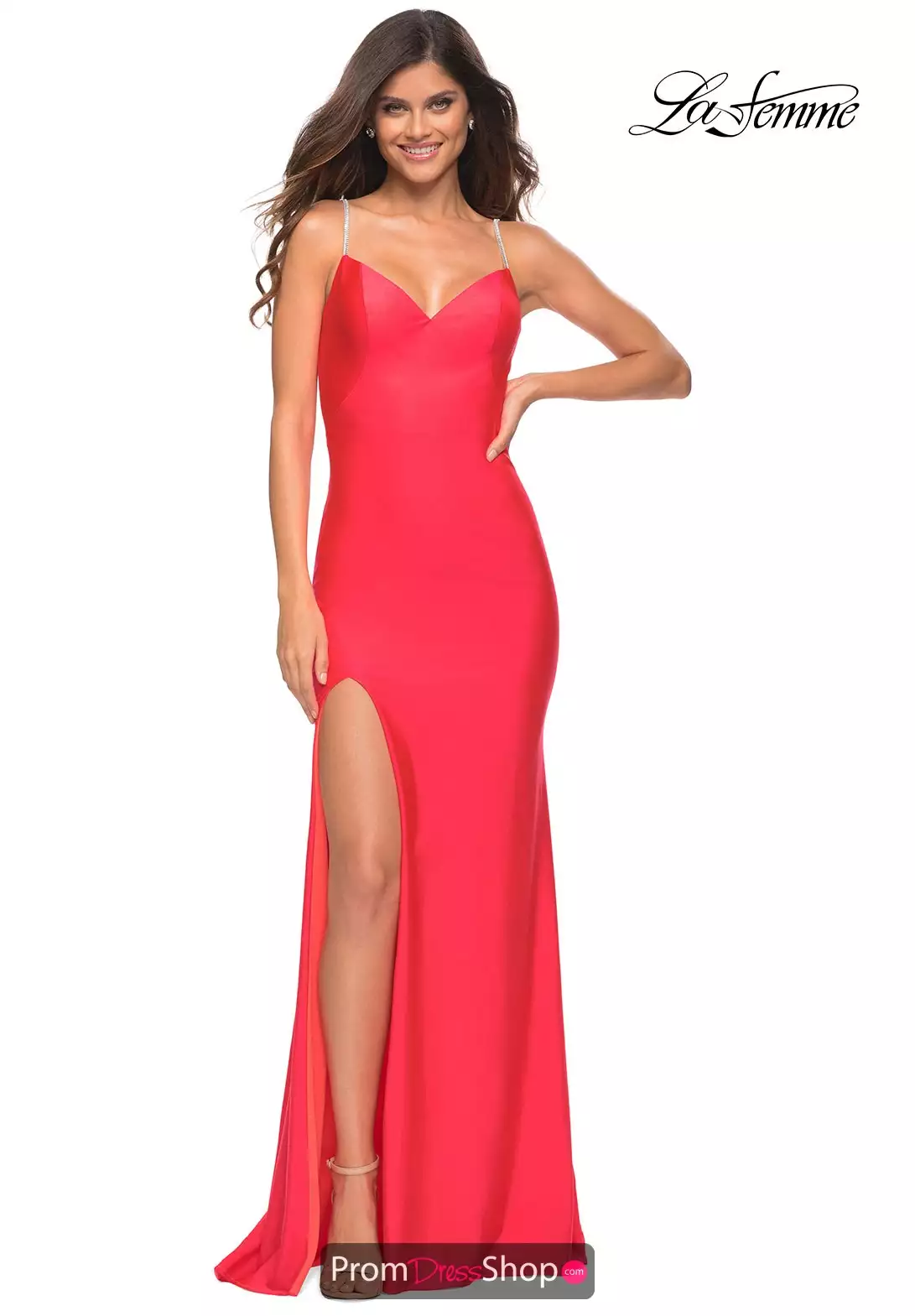 Exquisite long dress 30602 by La Femme has thin straps and a fitted silhouette.