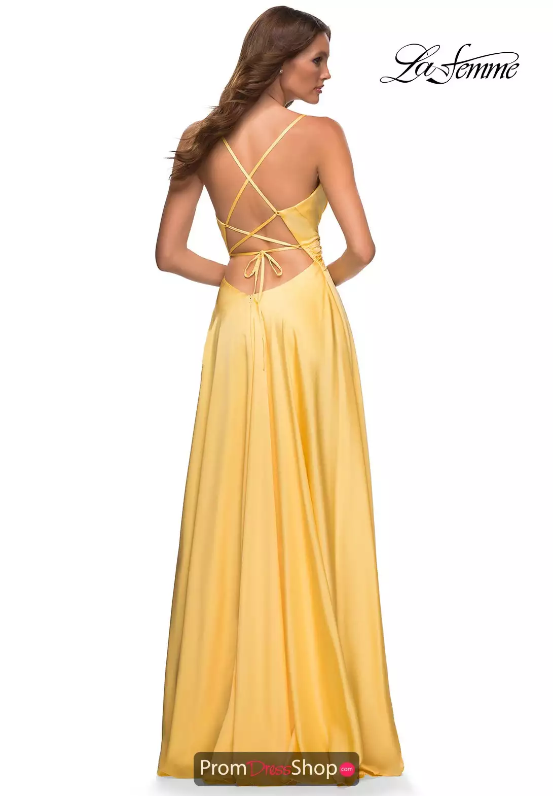 Less is definitely more, specially with this elegant La Femme dress 30662. Featuring a v neckline, the cross over fitted bodice is beautifully complemented by a corset lace up back. The a line gown is made out of soft satin material and is accompanied by a thigh high slit that gives it just enough drama to have you being the center of attention.