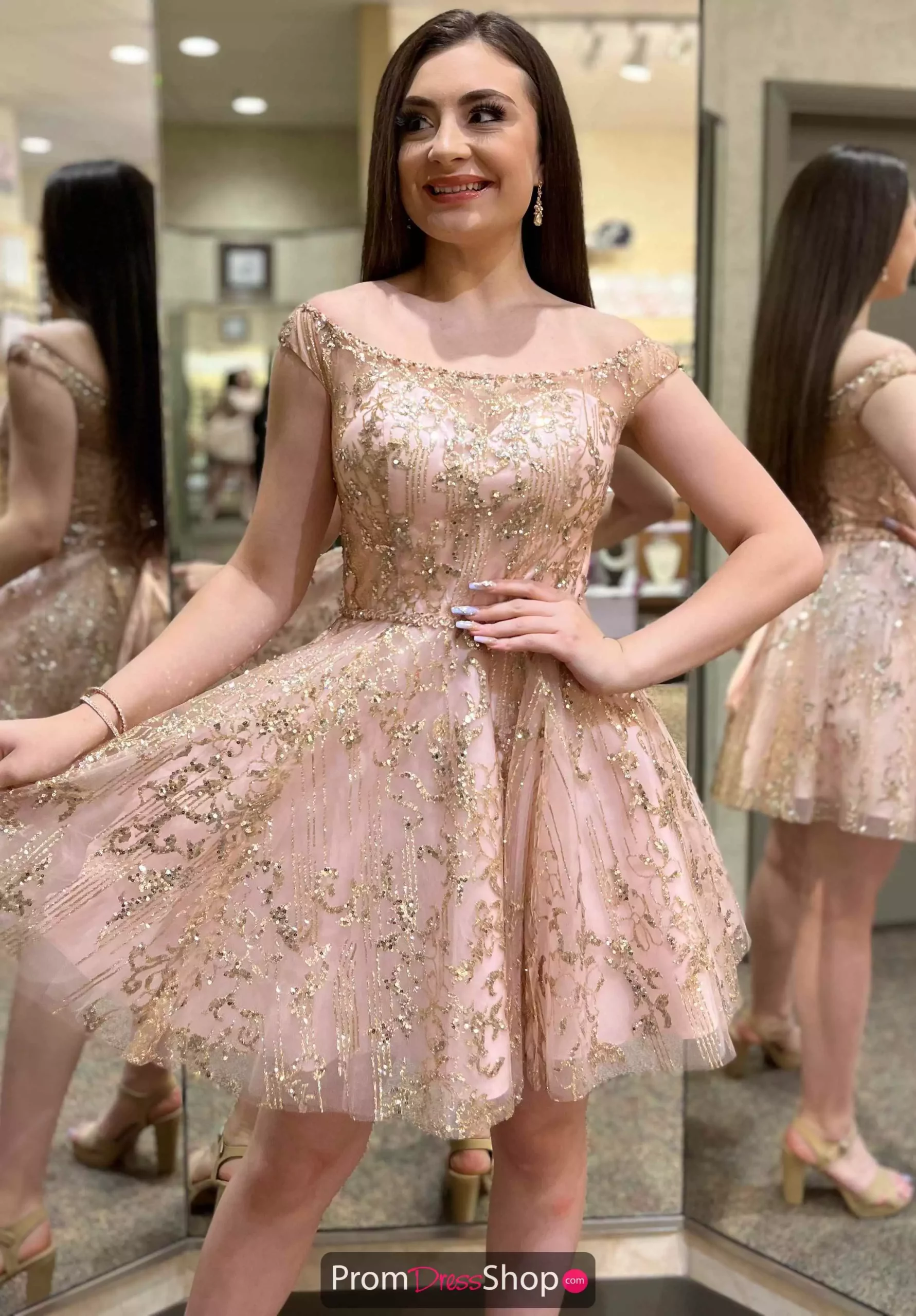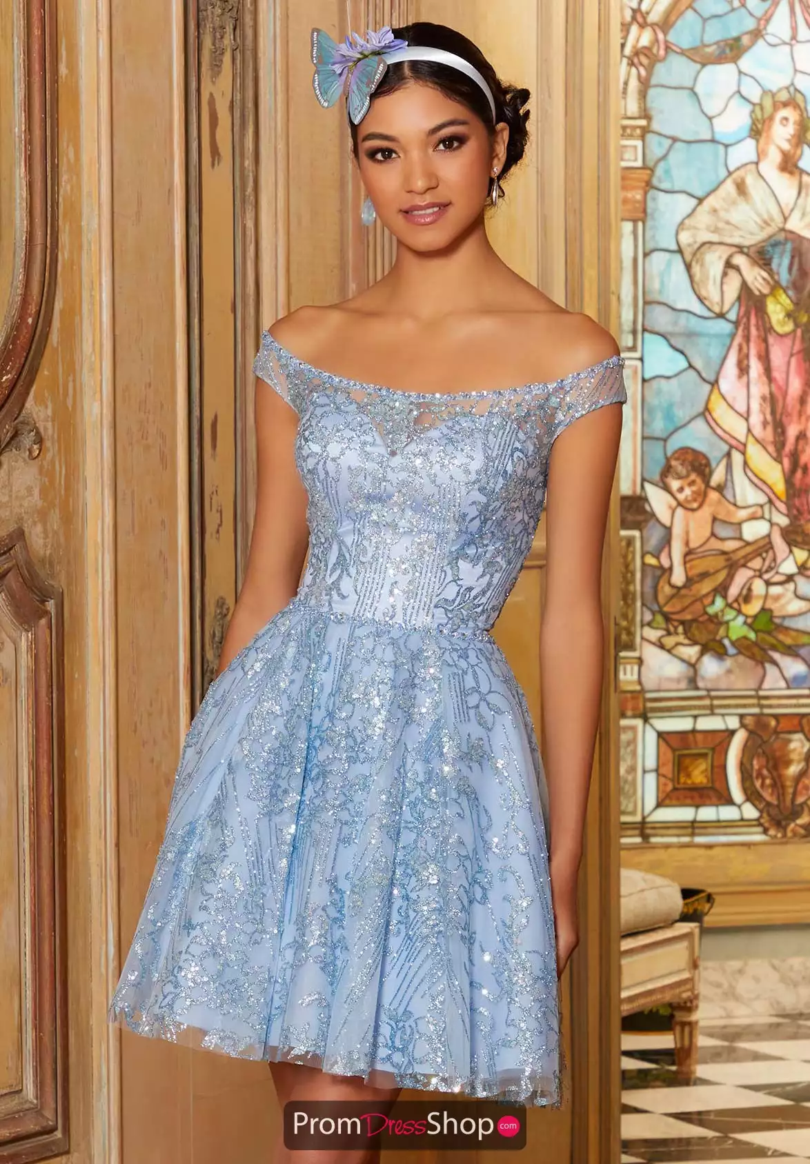 Off the shoulder short damas dress 9583 by Morilee is the perfect choice for your special occasion. The beautiful dress features a fitted bodice with sheer cap sleeves and corset lace up on the back to cinch you waistline perfectly. The glittered ensemble displays vintage floral inspired designs that give you a romantic touch to this flared skirt dress.