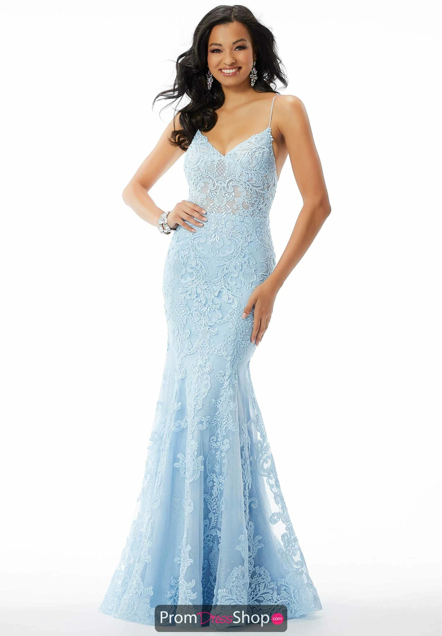 Elegant dress style 43017 by Morilee is the perfect choice for your next special event. This dress features a V-cut neckline with thin straps, with a sheer material fully laced bodice. The lace continues down the entire dress, a fitted material mermaid silhouette will show off your natural hourglass figure, making all eyes on you. Finished with an open back and a long train. For more, visit promdressshop.com