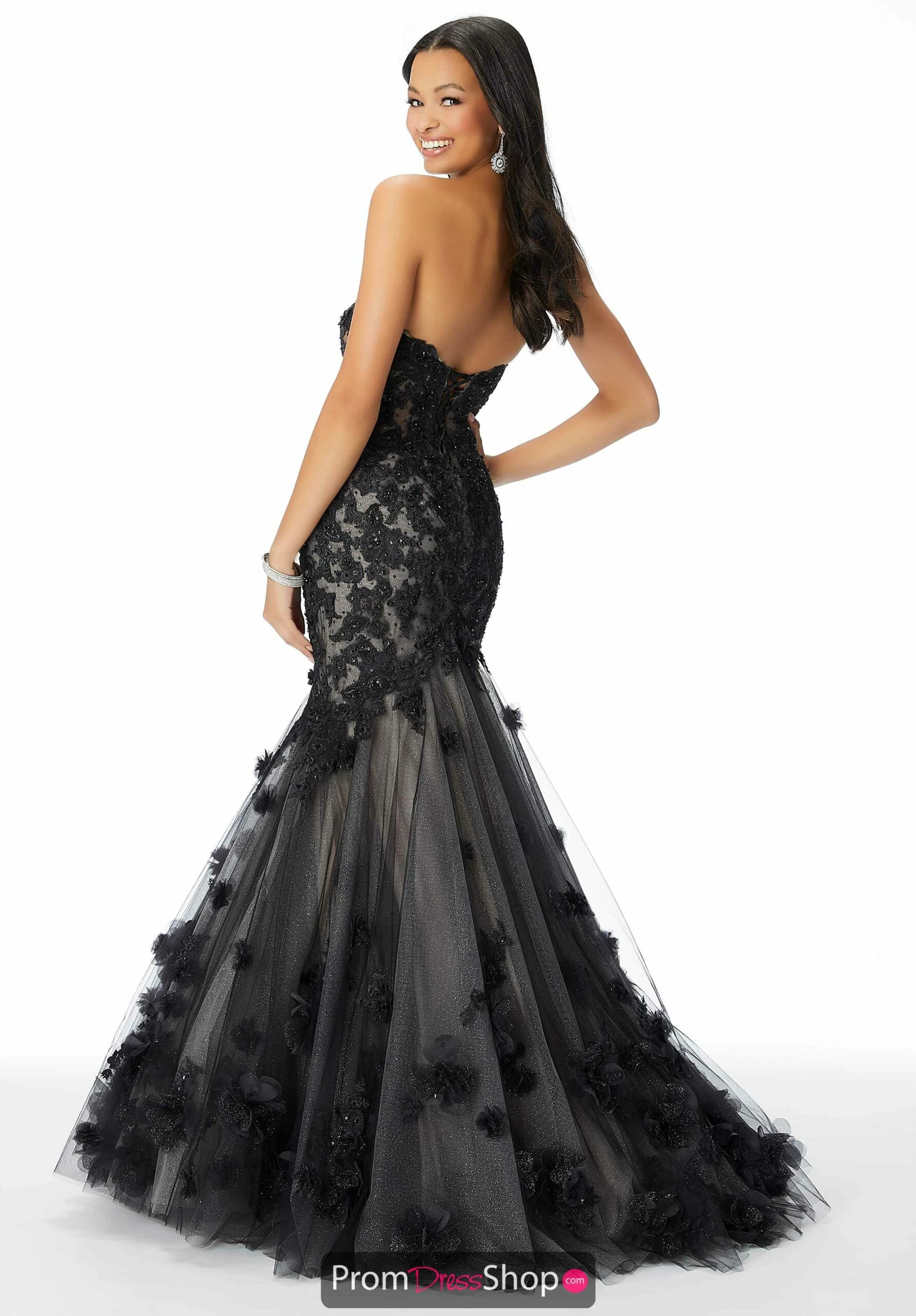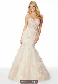 Dress to impress at your senior prom in this stunning classic Morilee mermaid dress 46002 adorned with beads, metallic embroidered appliqués, and three dimensional flowers on sparkle tulle. This magnificent gown showcases a fitted strapless corset bodice with a sweetheart neckline, exposed boning and a lace up tie back. The long mermaid skirt shimmers with appliques and flowers with a sweeping back train.