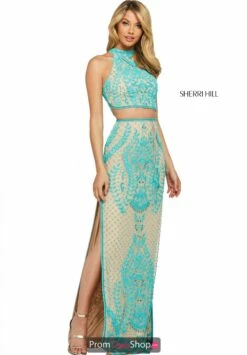 Rock this fabulous Sherri Hill two piece dress 53436 to your senior prom and have all eyes on you. This gorgeous style is adorned with contrasting hand sewn bead work and showcases a high neckline crop top and slim skirt with a side slit. The detail in the design of this style is absolutely incredible, find this today at www.promdressshop.com.