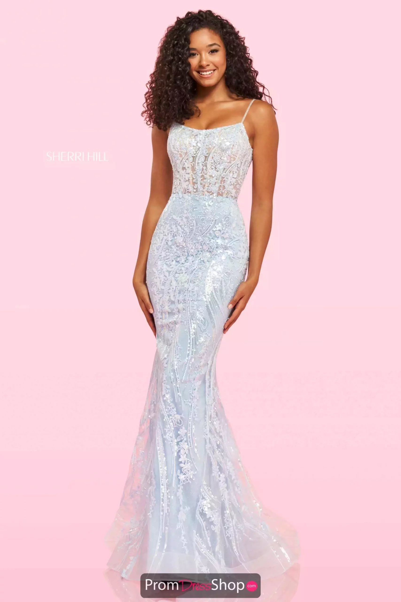 Ensure all eyes on you at your senior prom when slipping on this dainty Sherri Hill dress 54275. Hugging your silhouette beautifully, a scoop neckline adorns the bust as a comfortable lace up closure is placed along the back for a comfortable fit. Stunning floral embroidery decorates the entirety of the gown as sequins catch the light and light up the gown.