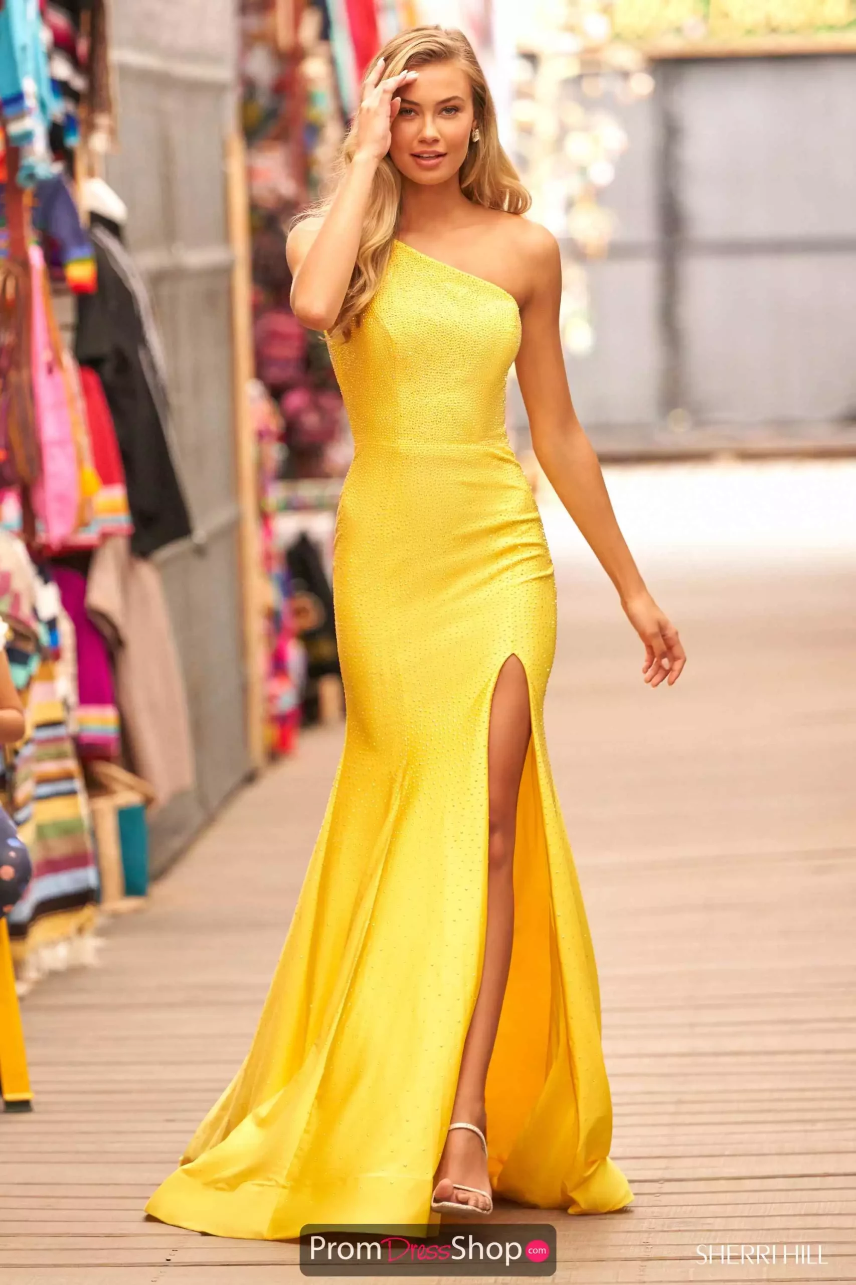 Feel like you just walked off the red carpet with this fitted style 54853 by Sherri Hill for your next social event. An asymmetrical neckline that will provide comfort all night long is paired with and alluring side front slit that will make it much easier to walk. Fully adorned from the bodice all the way down in tone on tone heated pressed stones offer the perfect amount of shimmer.