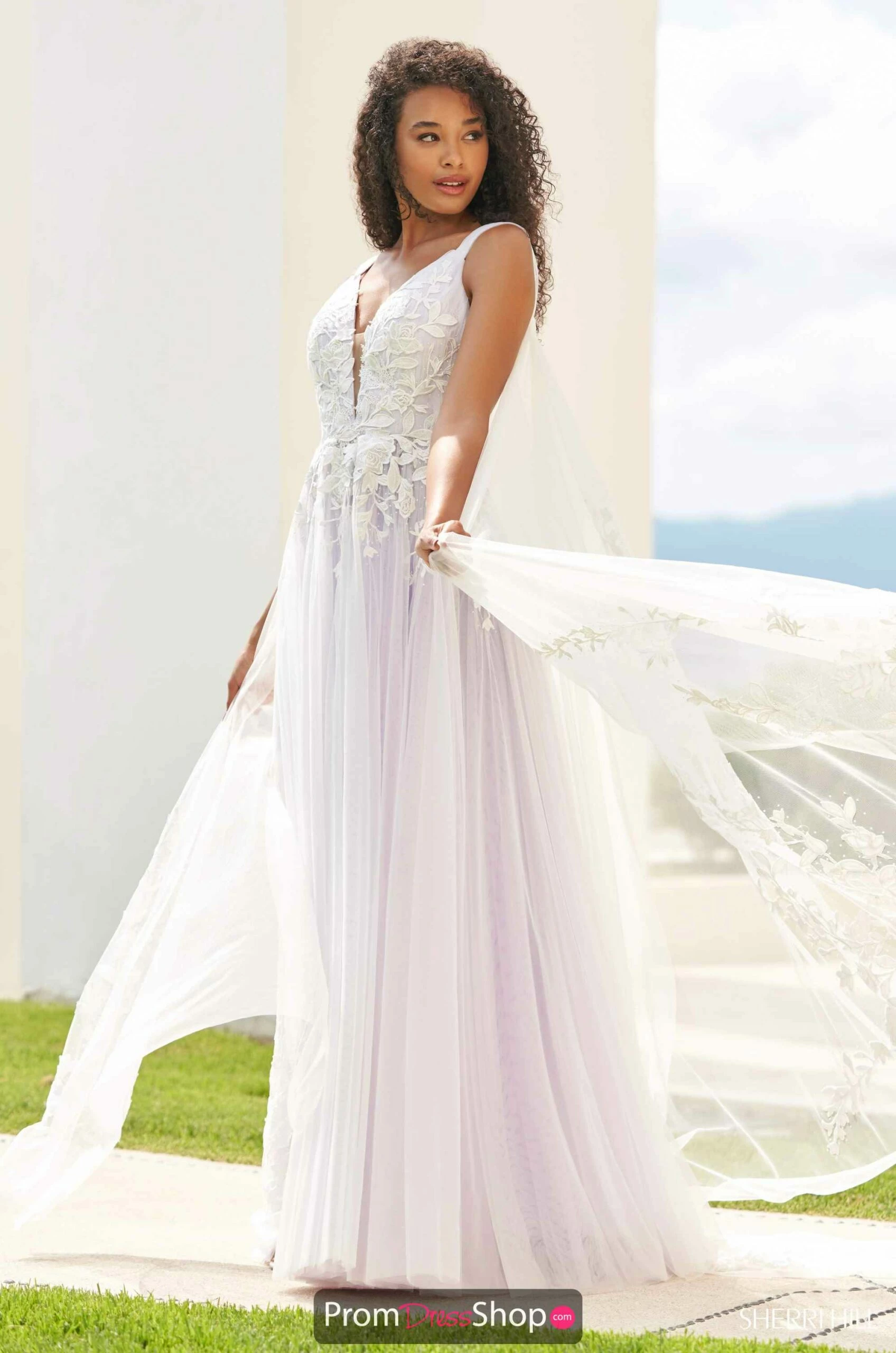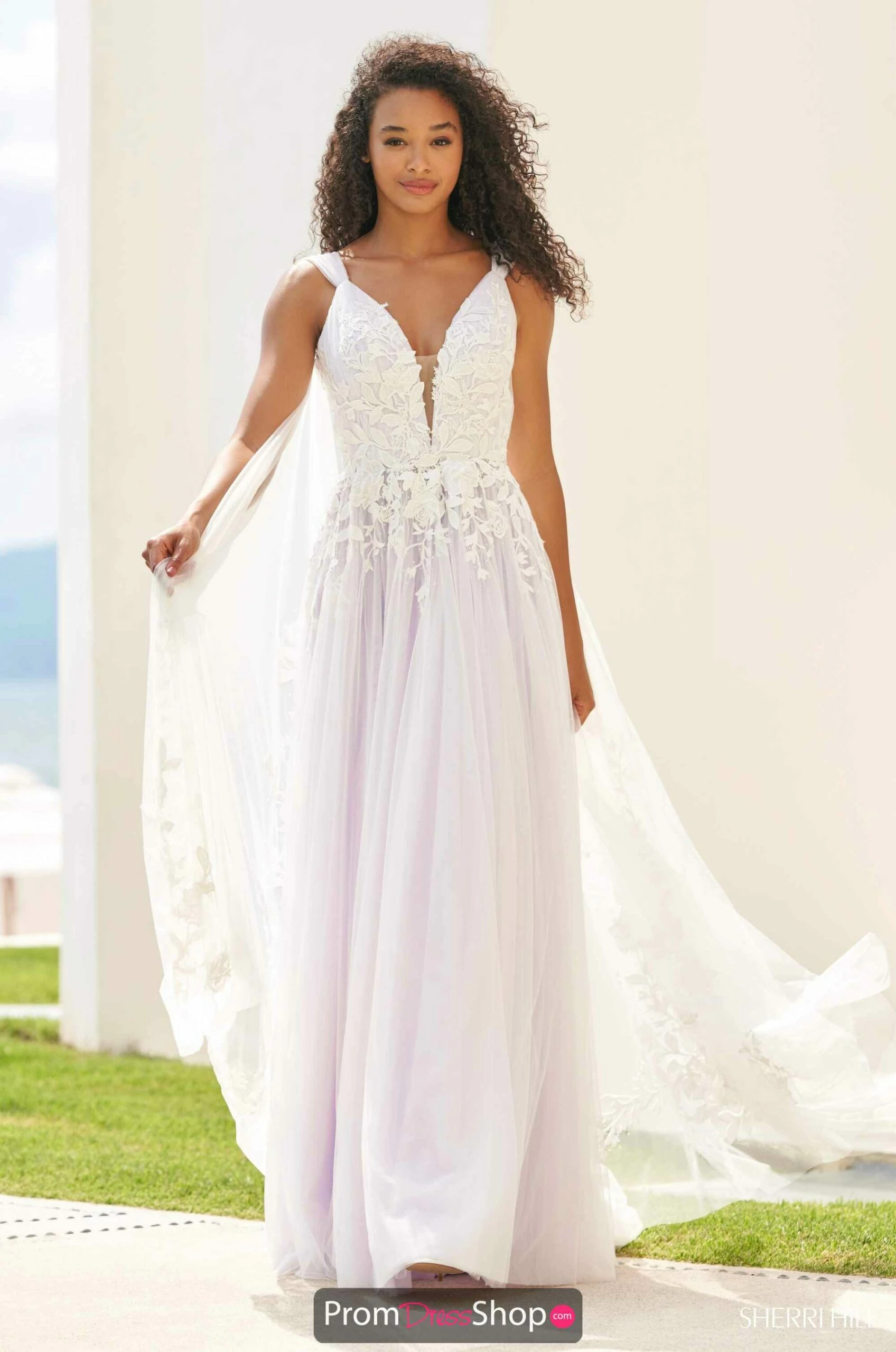 Elegant for any occasion this lovely ball gown dress 54859 by Sherri Hill features a low v neck and is paired with a complimentary open back. A fitted bodice is delicately adorned with floral lace applique and flows down the waist of the skirt. Completing the look with a gorgeous tulle skirt that offers a modern day princess feeling.