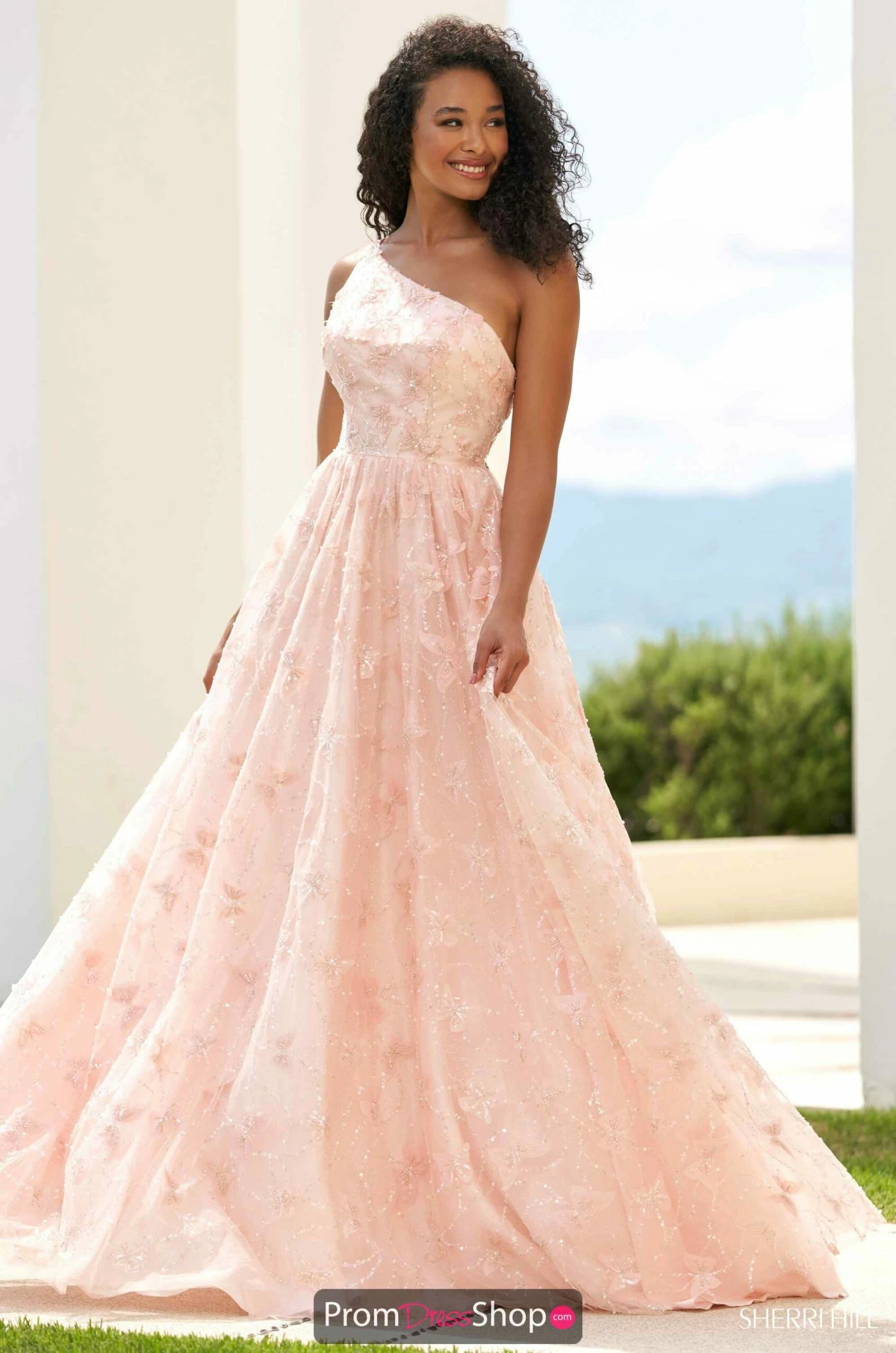 Twirl the night away in this gorgeous ball down style 55049 by Sherri Hill for your next occasion. The dress showcases a asymmetrical strap that will provide comfort all night long. Featuring its fitted bodice and full tulle skirt you will feel like a princess all night long. Beautiful 3 dimensional butterflies adorned all around complimented with sparkling swirls and beadwork distributed all along the gown.