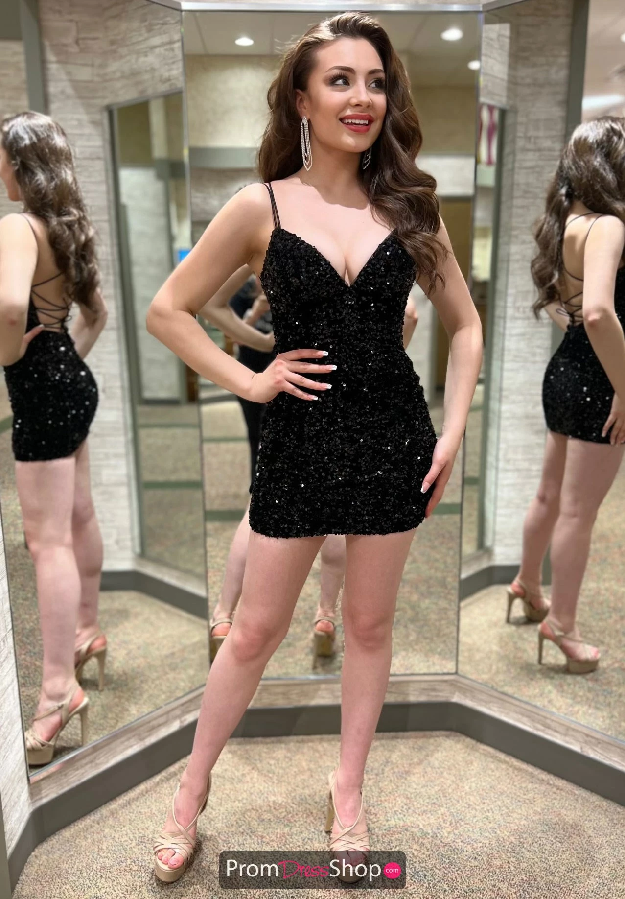 Stay on trend and choose this gorgeous Sherri Hill Short dress 55123 for your next special occasion. This body flattering silhouette showcases a low v cut with two thin straps that wrap around creating a lace up open back. Have all eyes fall on you with the illuminating sequins that will leave you shining all night.
