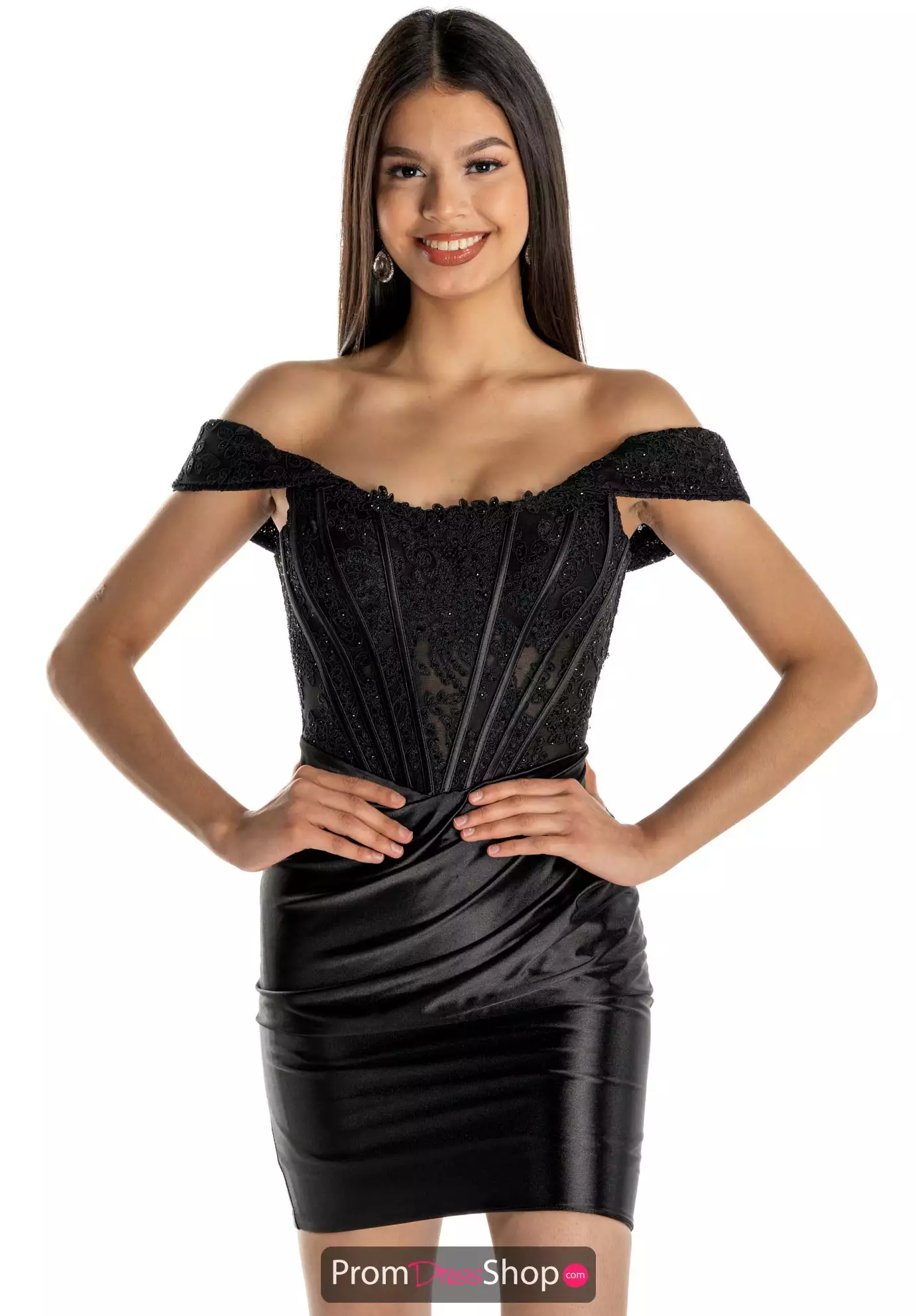 Regal chic short dress 55171 features a corset bodice adorned with lace appliques.