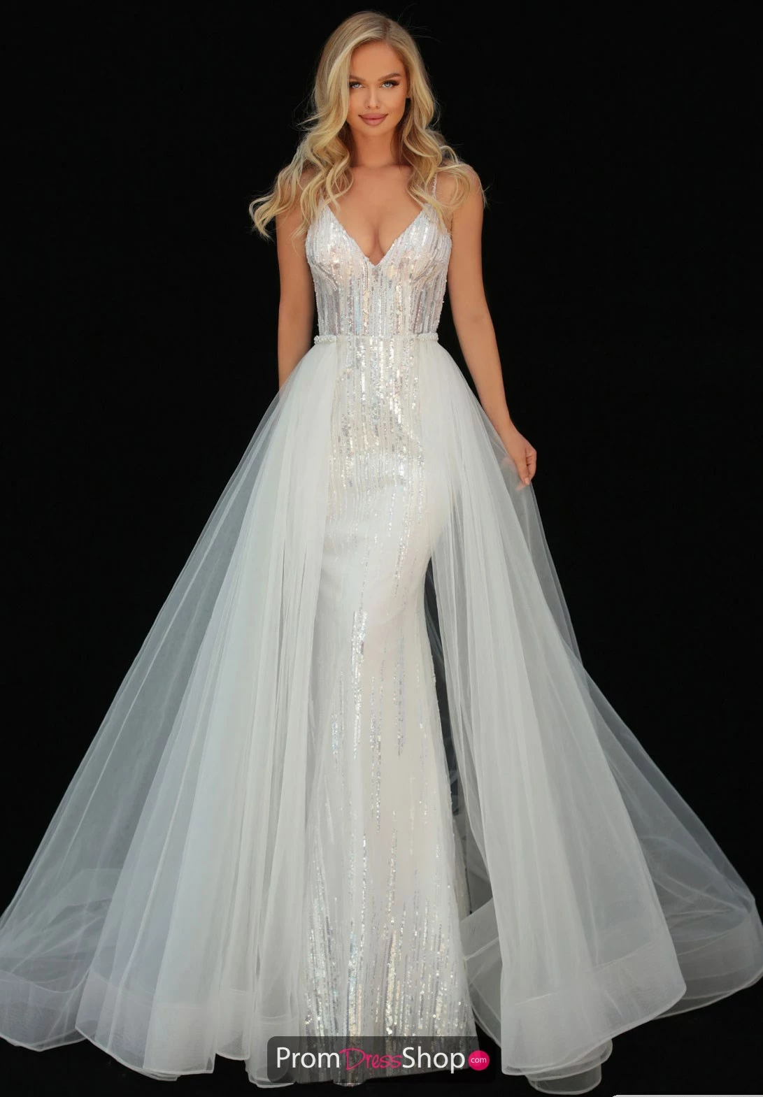 Have options when you choose exquisite long dress 51117 by Tarik Ediz as your dream dress. Shimmering sequins adorn the entire fitted silhouette in vertical striped patterns to give you ideal sparkle and detail. The fitted bodice displays a V neckline while the fit and flare skirt reveals a lavish sweep train. Style this dress with or without the striking tulle overskirt that serves as a dramatic sweep train.